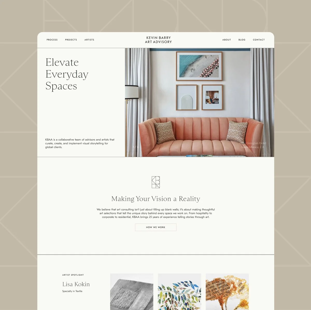 KBAA was originally known as Kevin Barry Fine Art, a growing national brand curating thoughtful art programs for hotels, commercial spaces, and homes. I led their repositioning and renaming to Kevin Barry Art Advisory (KBAA), crafting the tagline Elevate Everyday Spaces, and developing core brand messaging. We refreshed their visual identity and web design, paving the way for expansive growth and a distinguished reputation within the industry.